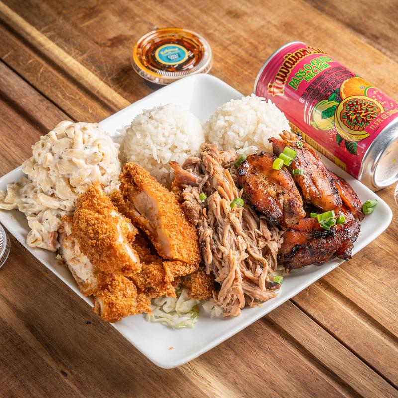 Combination Plate that includes choice of three 6 oz. meat portions, choice of white or brown rice, choice of Macaroni salad or Green Salad