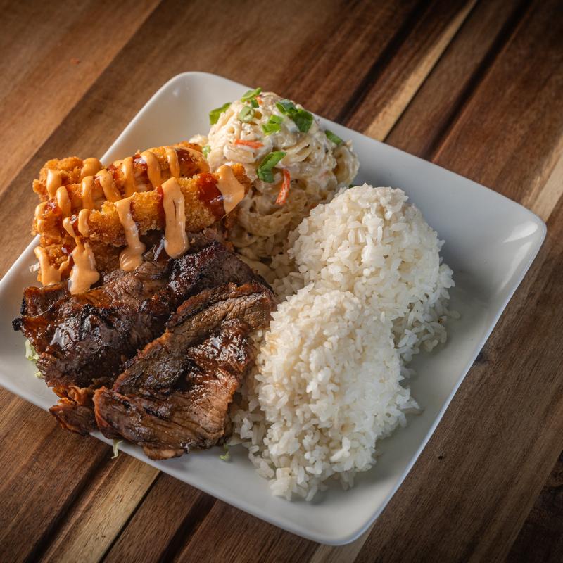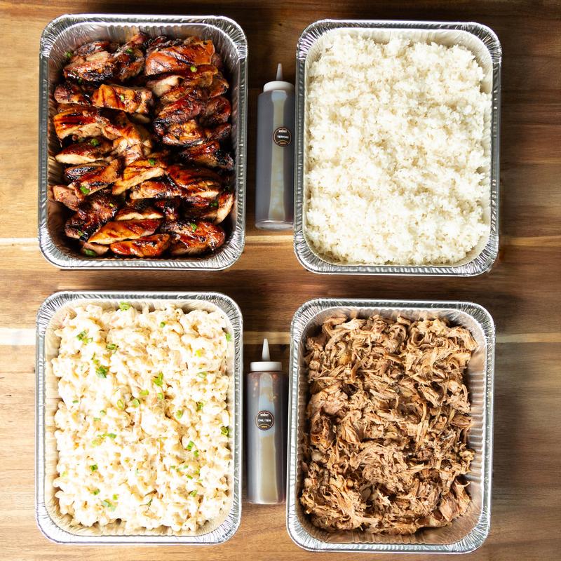 Includes your choice of two meats, white rice, macaroni salad, and two sauce bottles | 11.63 per person